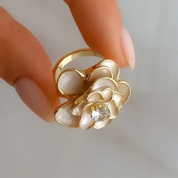 Anillo flor petalos esmaltados color canela perlado, más brillante engarzado en el centro.