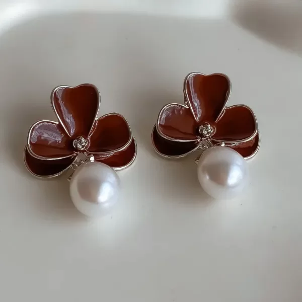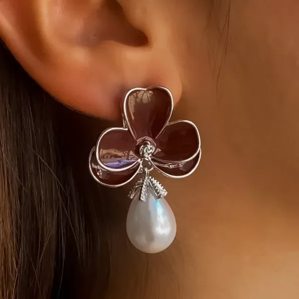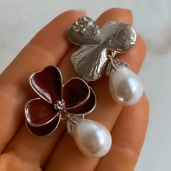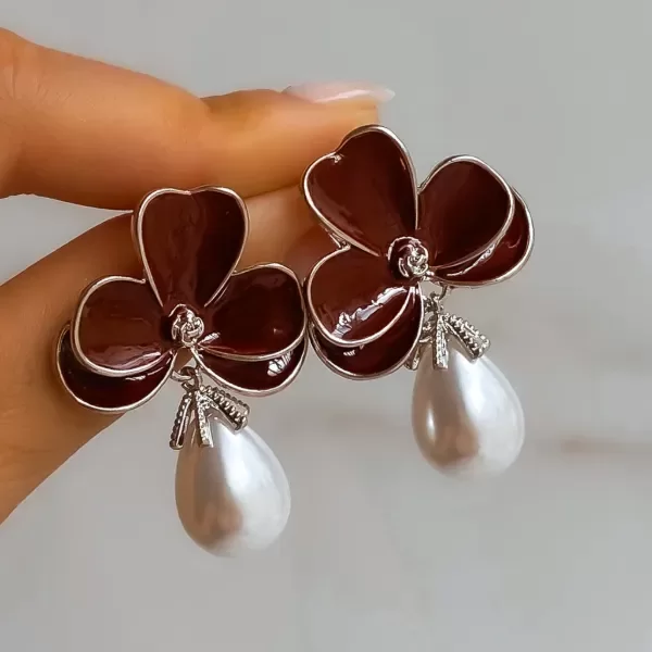 Par de aros en tono vino que combina una flor delicada y una símil perla colgante, creando un diseño que respira elegancia y sutileza. Una fusión de encanto clásico y romanticismo moderno.