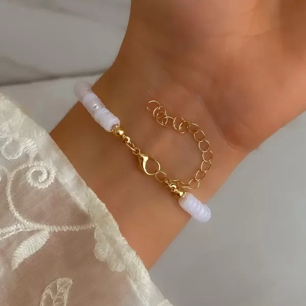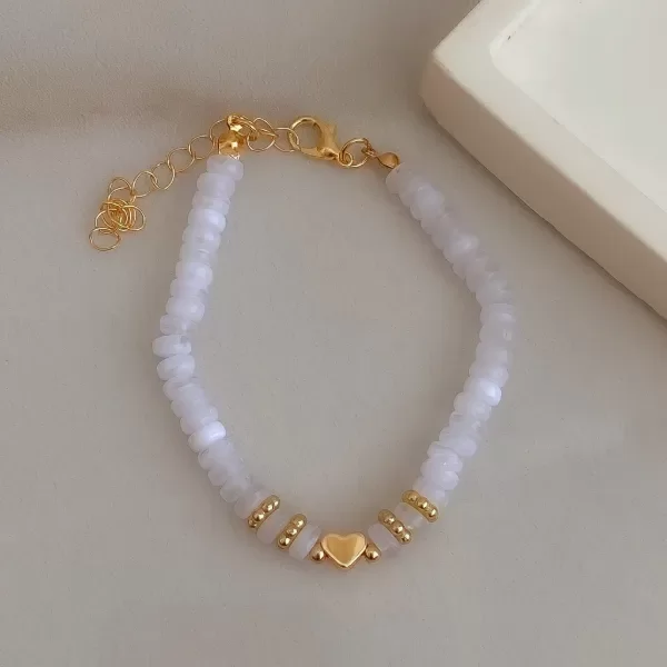 Pulsera de mostacillas con dije de corazón dorado.