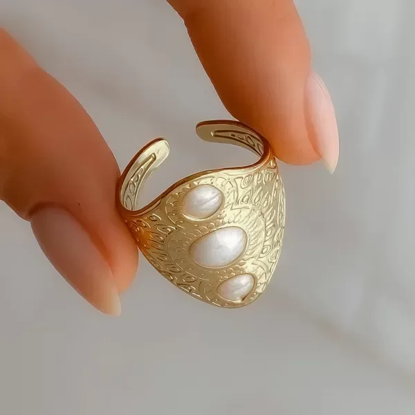 Anillo de diseño grande con arabescos estilo mandala y tres puntos esmaltados en color blanco perlado.