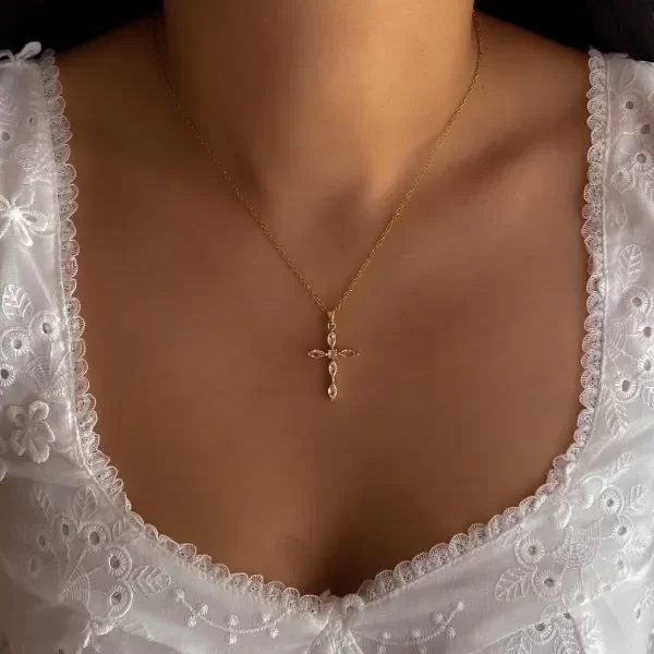 Collar de cadena tiffany con dije cruz, terminada en brillantes.