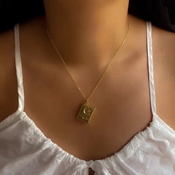 Material: Cadena de acero dorado y dije de bronce bañado en metales dorados.
