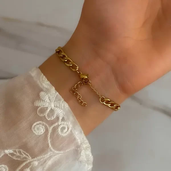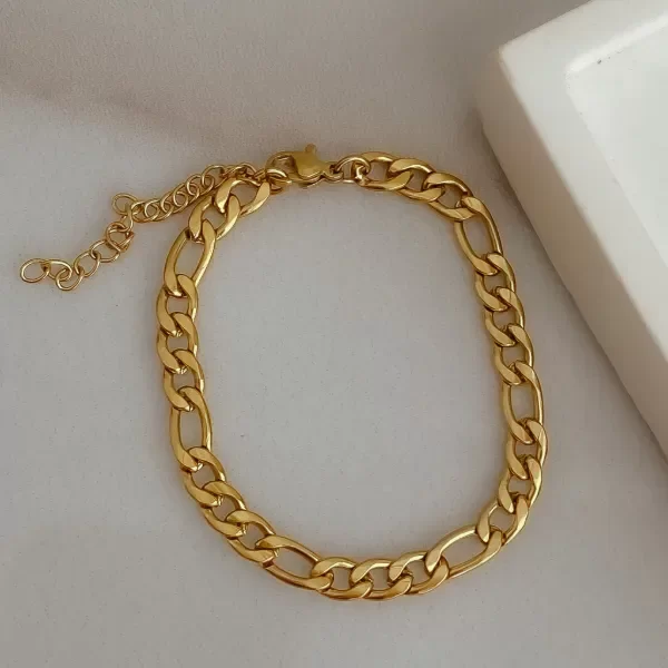 Pulsera punto fígaro con secuencia de tres eslabones pequeños y uno grande.