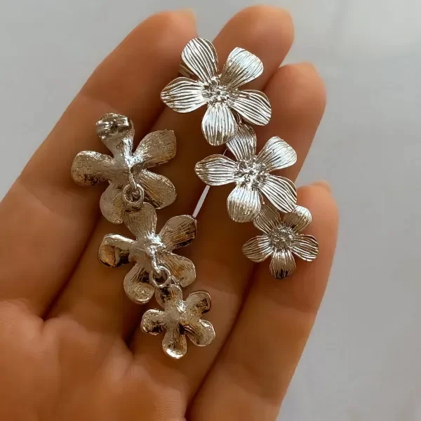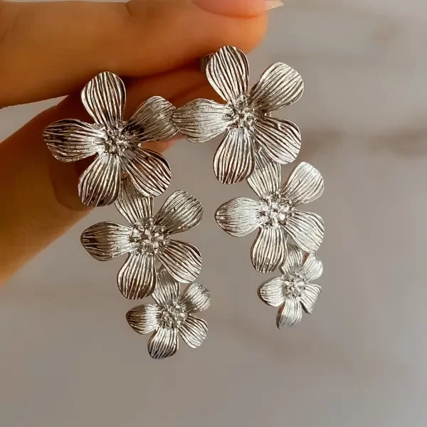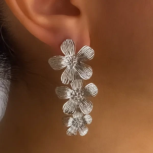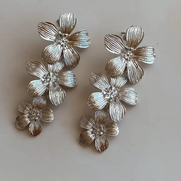 Par de aros tres flores que descienden en delicado degradé, con pétalos labrados que realzan su brillo.