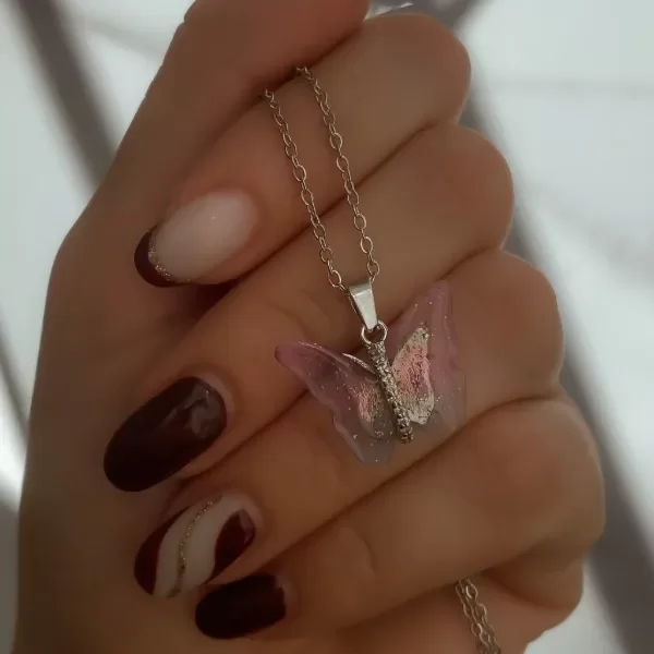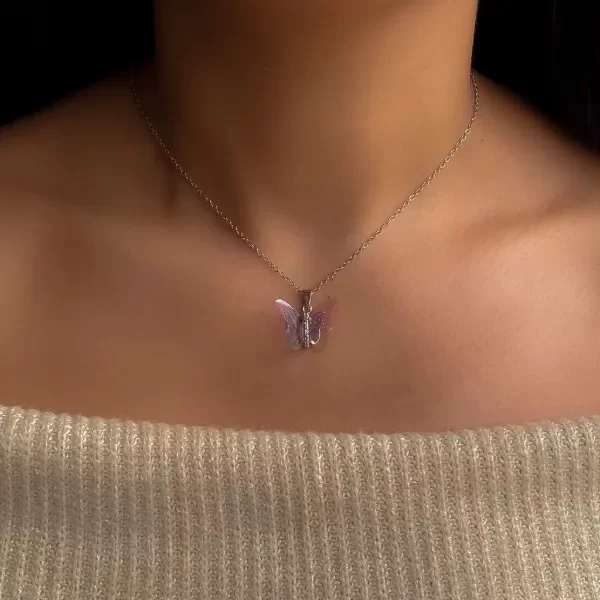 Conjuntos cadena tiffany más dije mariposa en tonos lilas y celestes, terminada en brillantes.
